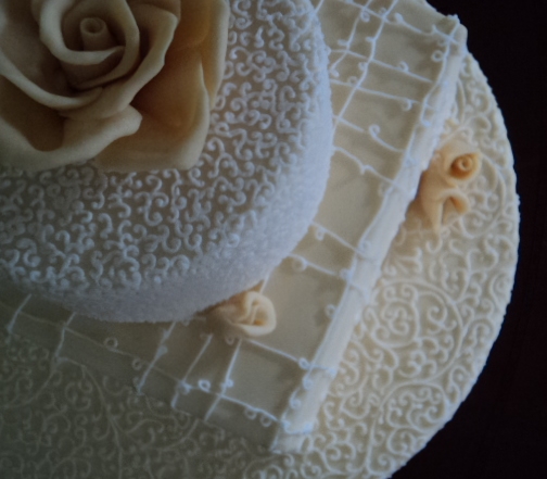 Soft, buttery yellow-colored chocolate roses atop fondant covered cake with delicate piping